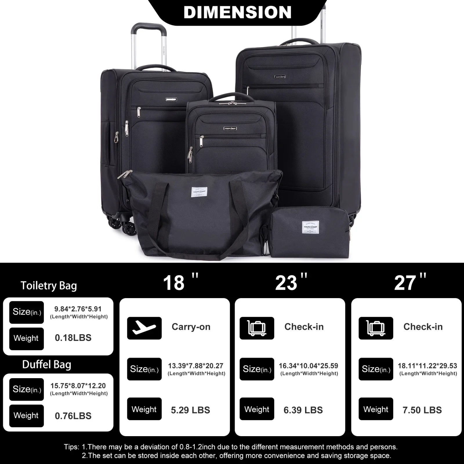 Luggage Set: includes 18-inch carry-on luggage, 23 / 27 luggage, travel duffle bag, and a toiletry bag. The Carry On Suitcase with wheels is sized to fit in overhead bins or underseat. The travel backpack is designed with a back sleeve that attaches to a retractable luggage handle. Large capacity and fully equipped to meet your different travel needs.